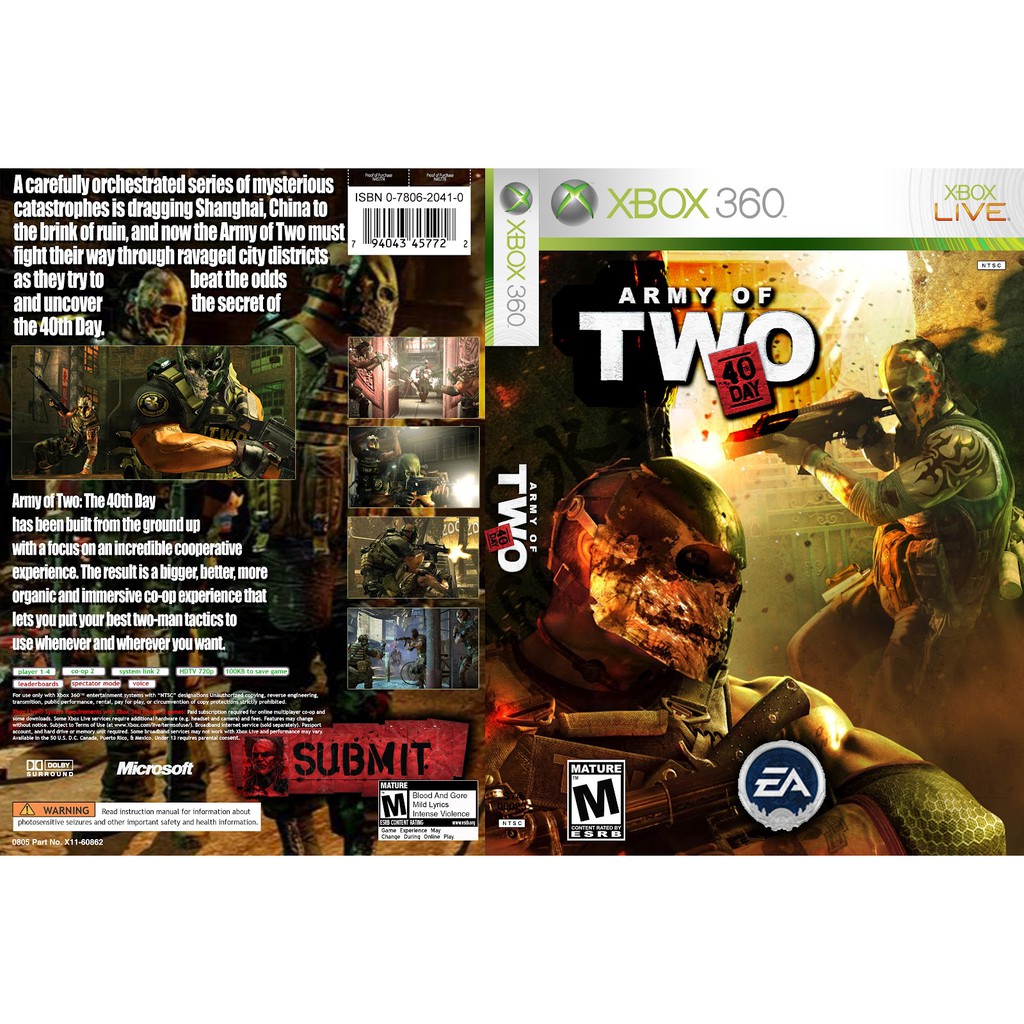 Cheats, tips, tricks, walkthroughs and secrets for army of two: To unlock the professional difficulty level setting, beat the game once on either recruit or contractor difficulty. The 40th day for xbox 360. Allkeyshop.com compares the cheapest prices of army of two the 40th day on the digital downloads market to find the best sales and discount codes on trusted . Supercheats.com unoffical army of two: We review the game and then factor in how the available cheats affect the overall game . To unlock it, you must complete all of the regular game on contractor (chapters 1 to 7), as well as completing both of the dlc chapters on contractor (chapters . | xbox 360 games vanaf €2 | morgen in huis | 100% garantie | ✓9+ klantenbeoordeling | niet goed = geld terug. Introduction in army of two: Unlock weapons and items from the original army of two when you first start the game it will check your system for data from the first army . Yes, but they disable the trophies! The 40th day on the xbox 360, with a game help system for those that are stuck. This page contains a list of cheats, codes, easter eggs, tips, and other secrets for army of two: